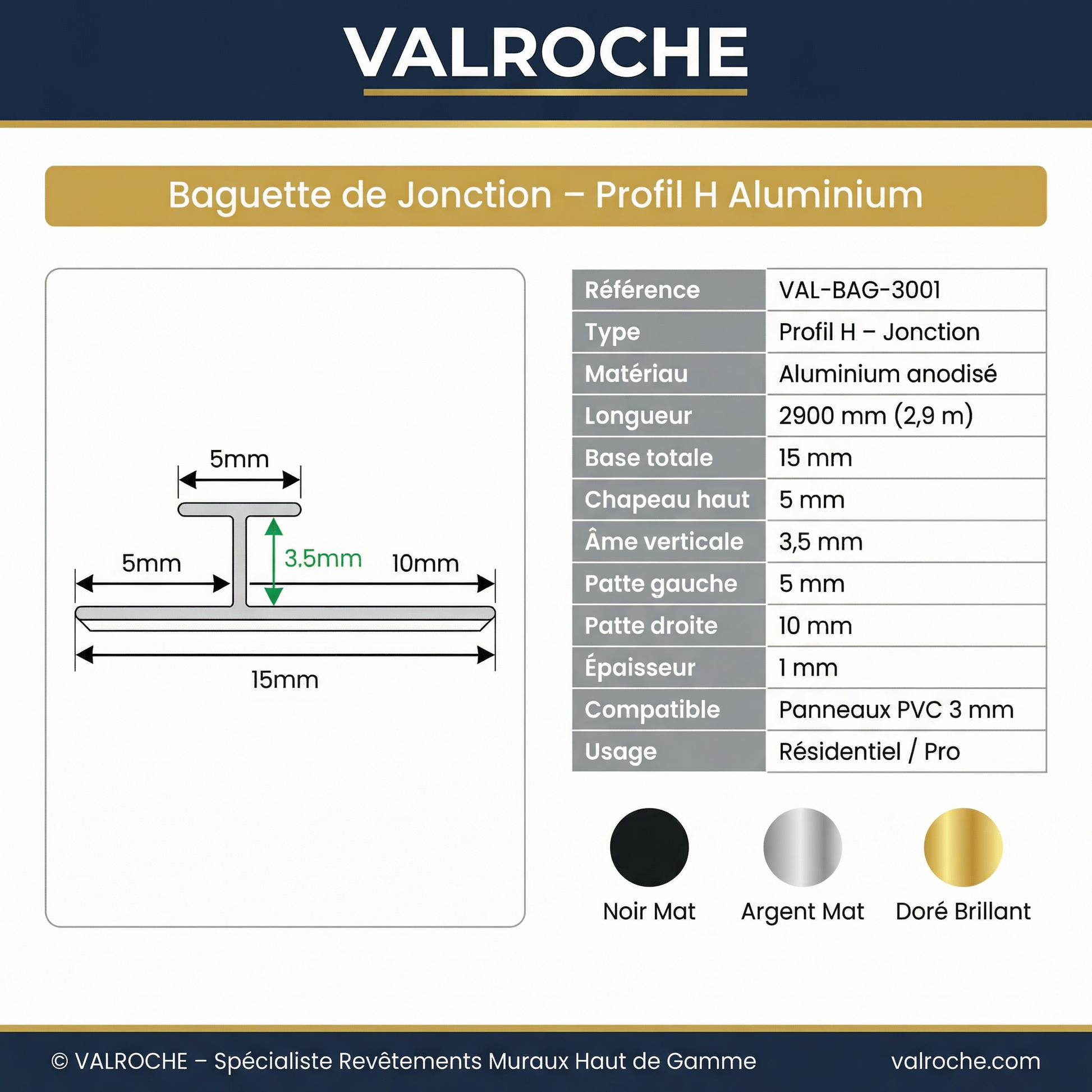Baguette de Jonction Aluminium Profil H Premium – 2,9 m – Panneaux PVC 3 mm